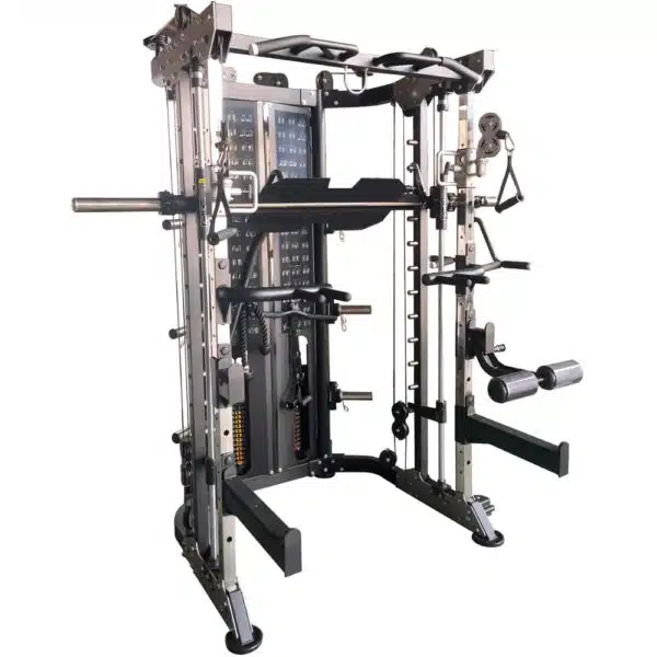 - Combines 3 essential machines (functional trainer, Smith machine, half rack) into one unit
